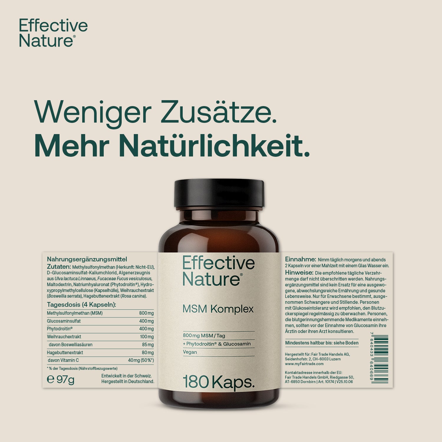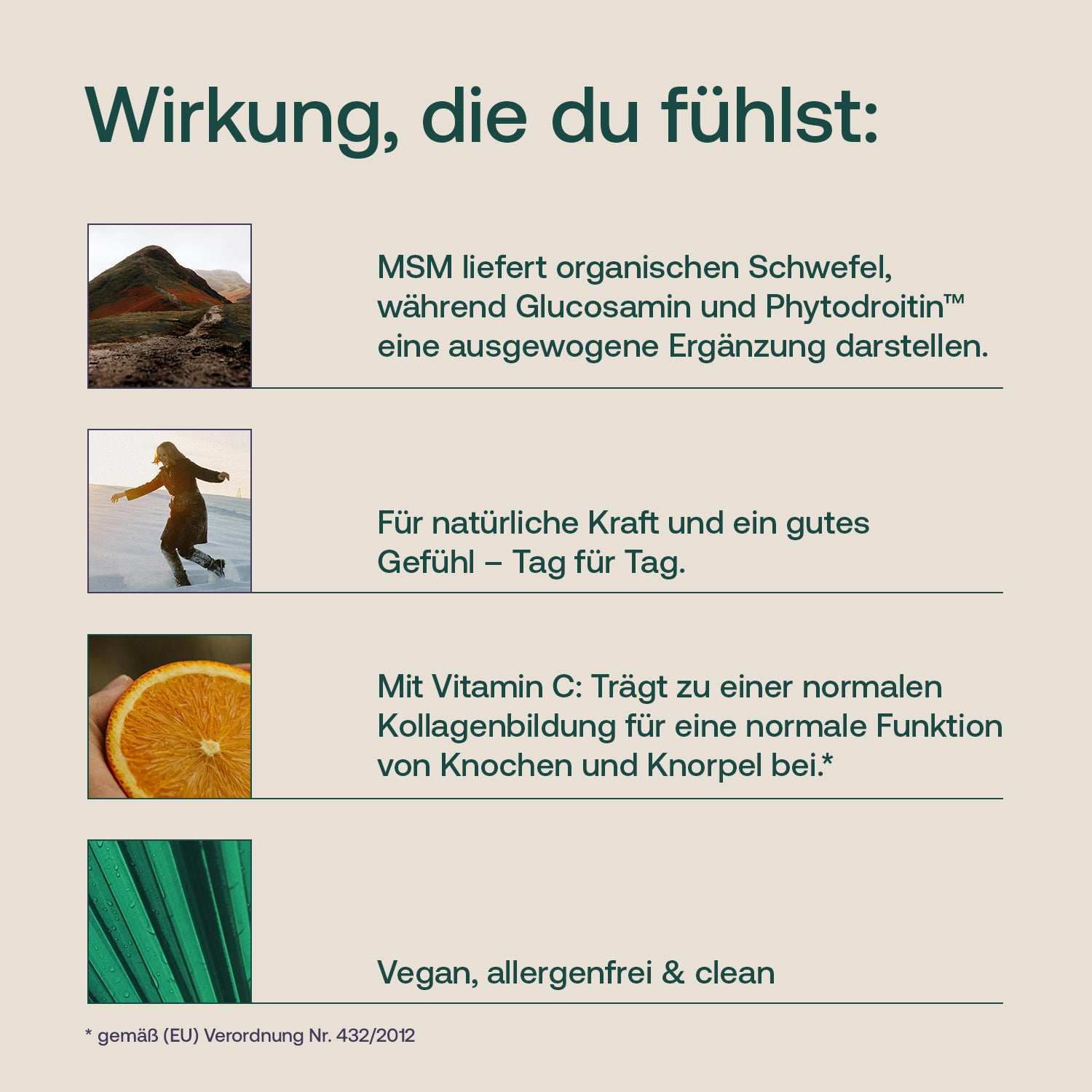 Ein besonderes Merkmal des MSM Komplex ist die Verwendung von Phytodroitin™, einer rein pflanzlichen und patentierten Alternative zum klassischen, meist tierischen Chondroitin. Gemeinsam mit Glucosamin bildet dieser Stoff ein Duo, das den natürlichen Bestandteilen des menschlichen Gelenkknorpels und der Knorpelflüssigkeit nachempfunden ist.