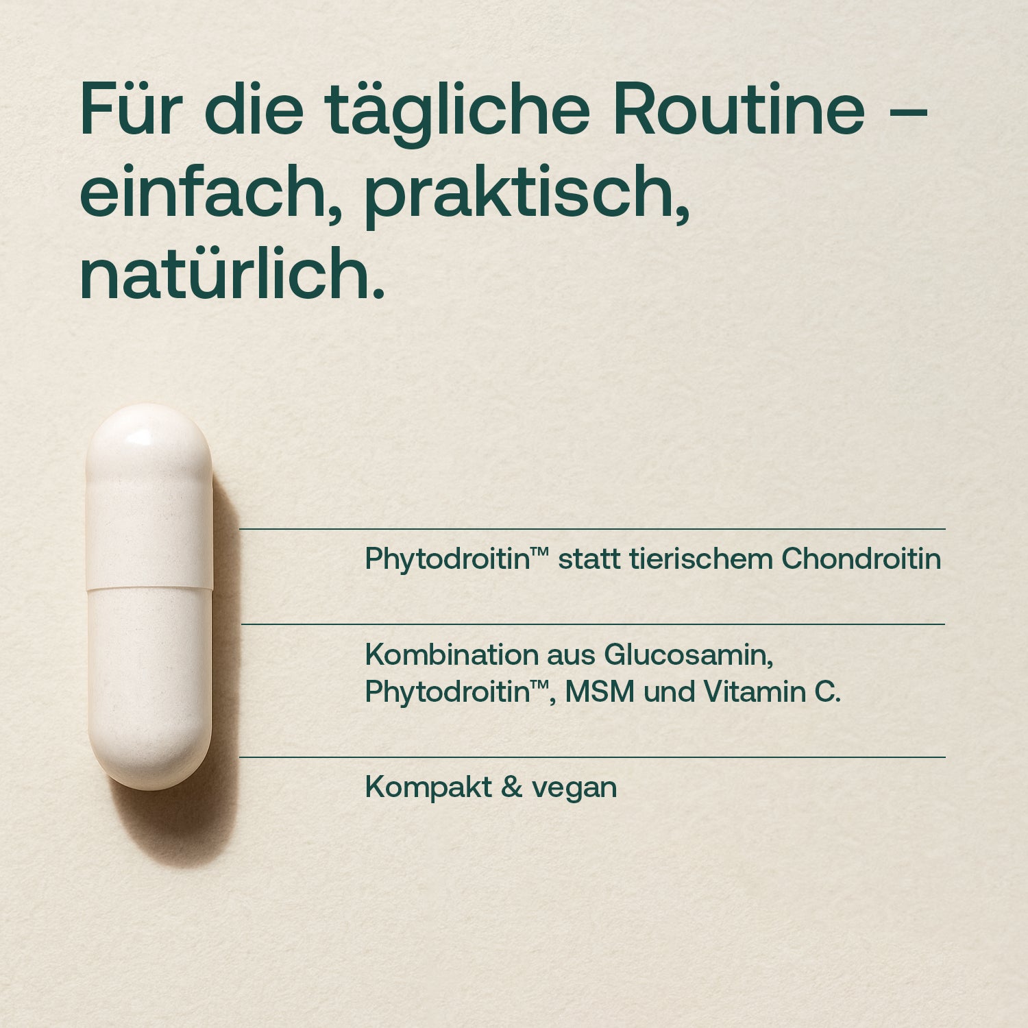 Die Kombination aus Glucosamin und dem patentierten Markenrohstoff Phytodroitin™ bietet eine zu 100 % pflanzliche Alternative zu herkömmlichem Chondroitin. -