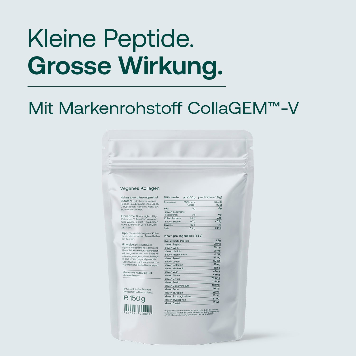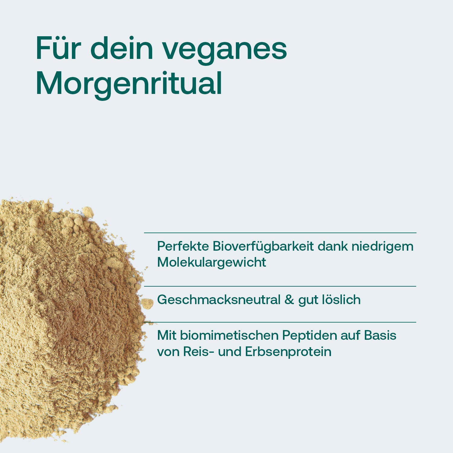 Die enthaltenen Peptide stammen aus Reis- und Erbsenprotein und bilden eine pflanzliche Alternative zu tierischem Kollagen. -