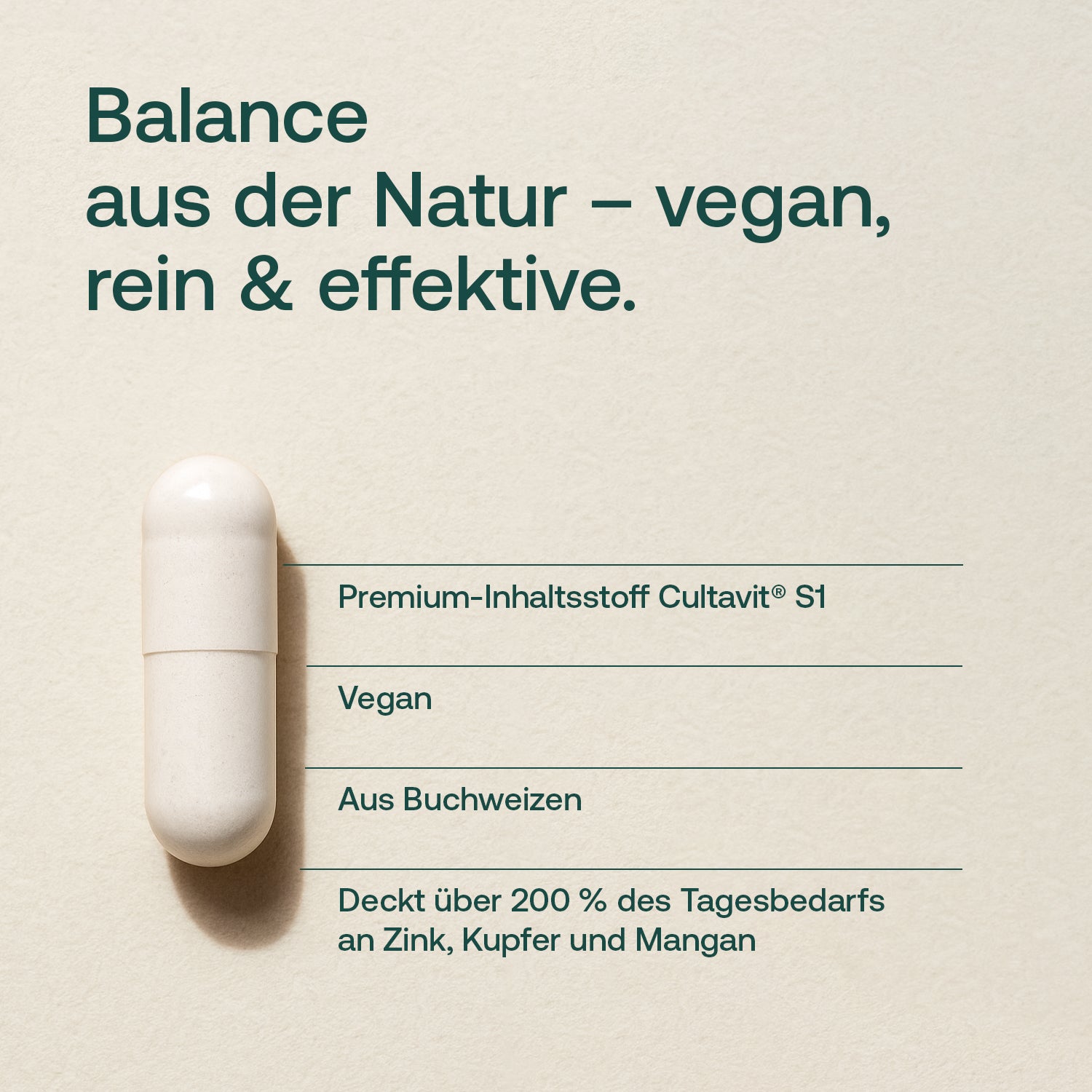 Zink Komplex aus Buchweizen mit Mangan und Kupfer liefert die Nährstoffe in hochdosierter Form. Zink unterstützt den Erhalt normaler Haut, Haare und Nägel und trägt zu einer normalen kognitiven Funktion bei. Ergänzt wird es durch Kupfer und Mangan, zwei Spurenelemente, die ebenfalls natürlicherweise im Stoffwechsel vorkommen und weitere Aufgaben übernehmen. So trägt Kupfer zur Erhaltung von normalem Bindegewebe und zu einer normalen Funktion des Nervensystems bei, während Mangan bei der Erhaltung normaler Knochen und dem Energiestoffwechsel eine Rolle spielt.